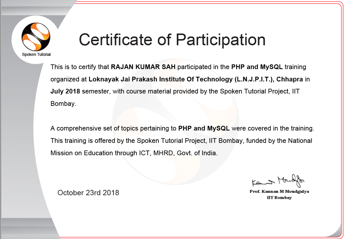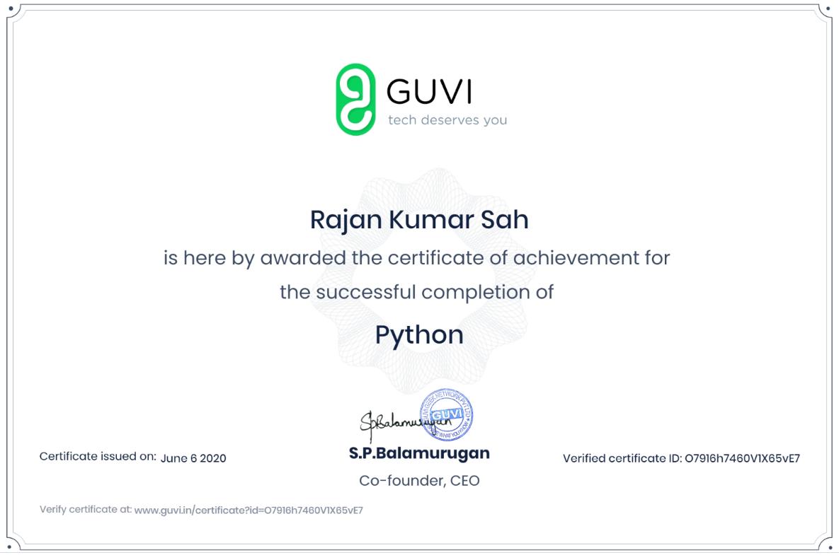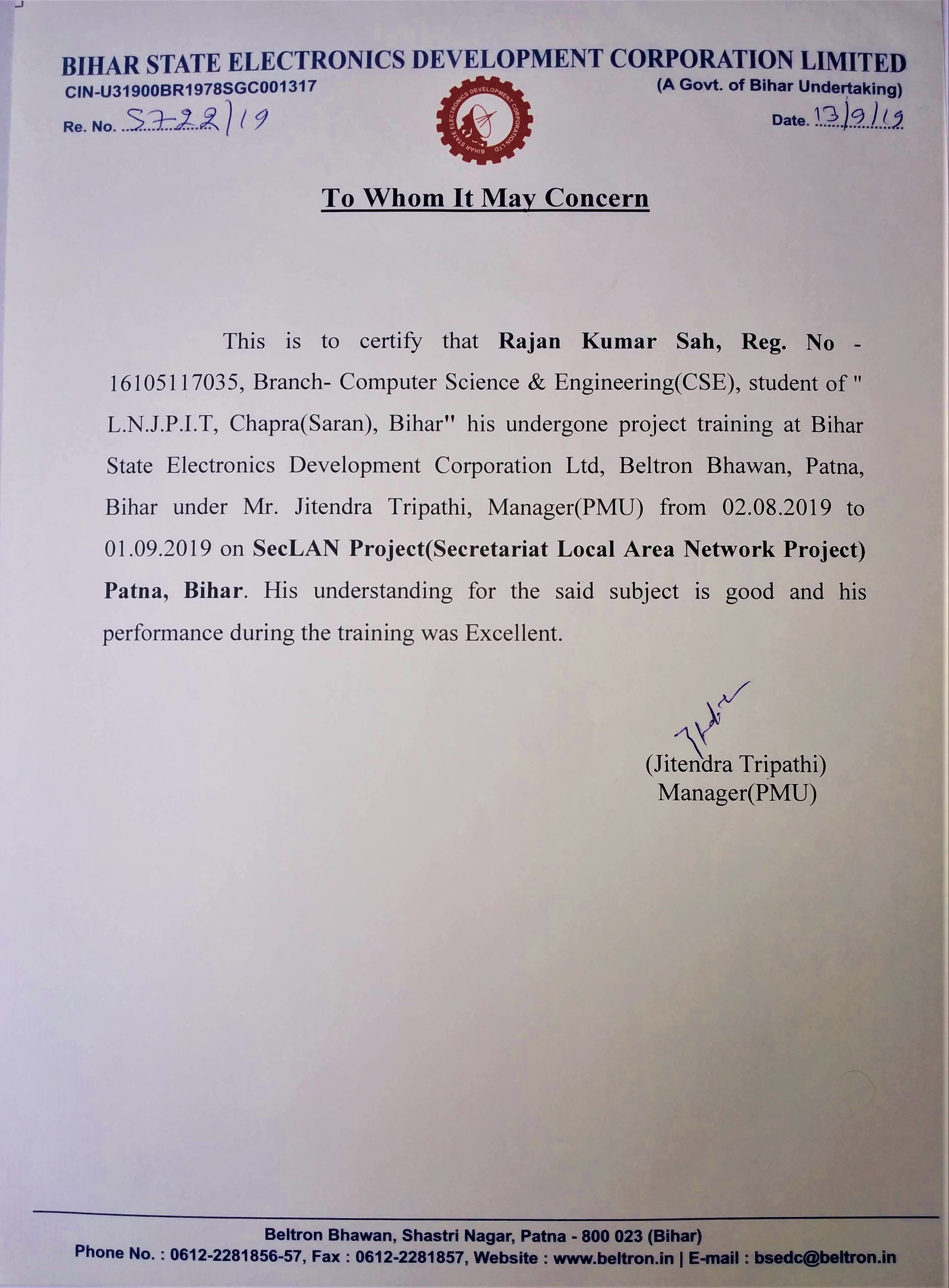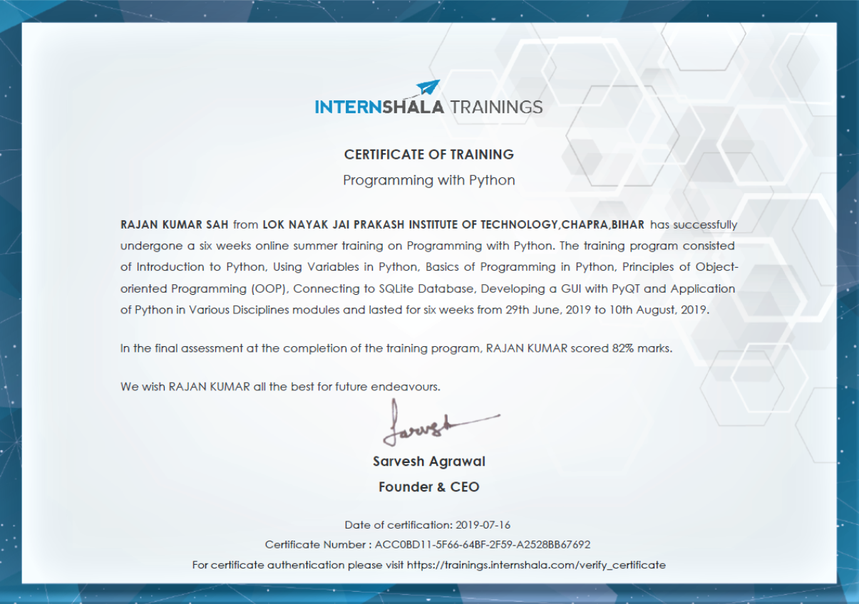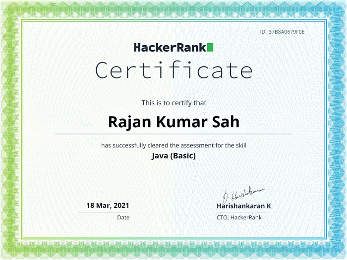 Hii.., My self Rajan Kumar Sah. I’ve recently completed my "Bachelor of Technology" degree in Computer Science & Engineering Branch from Lok Nayak Jai Prakash Institute of Technology Chapra (Bihar) and looking for "Software Developer" Jobs. I'm a ⭐⭐⭐⭐⭐ 5 Star Coder at HackerRank Platform.