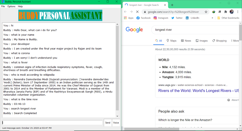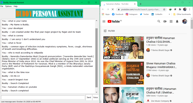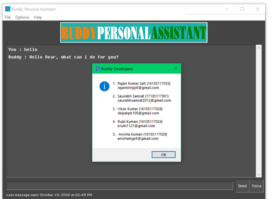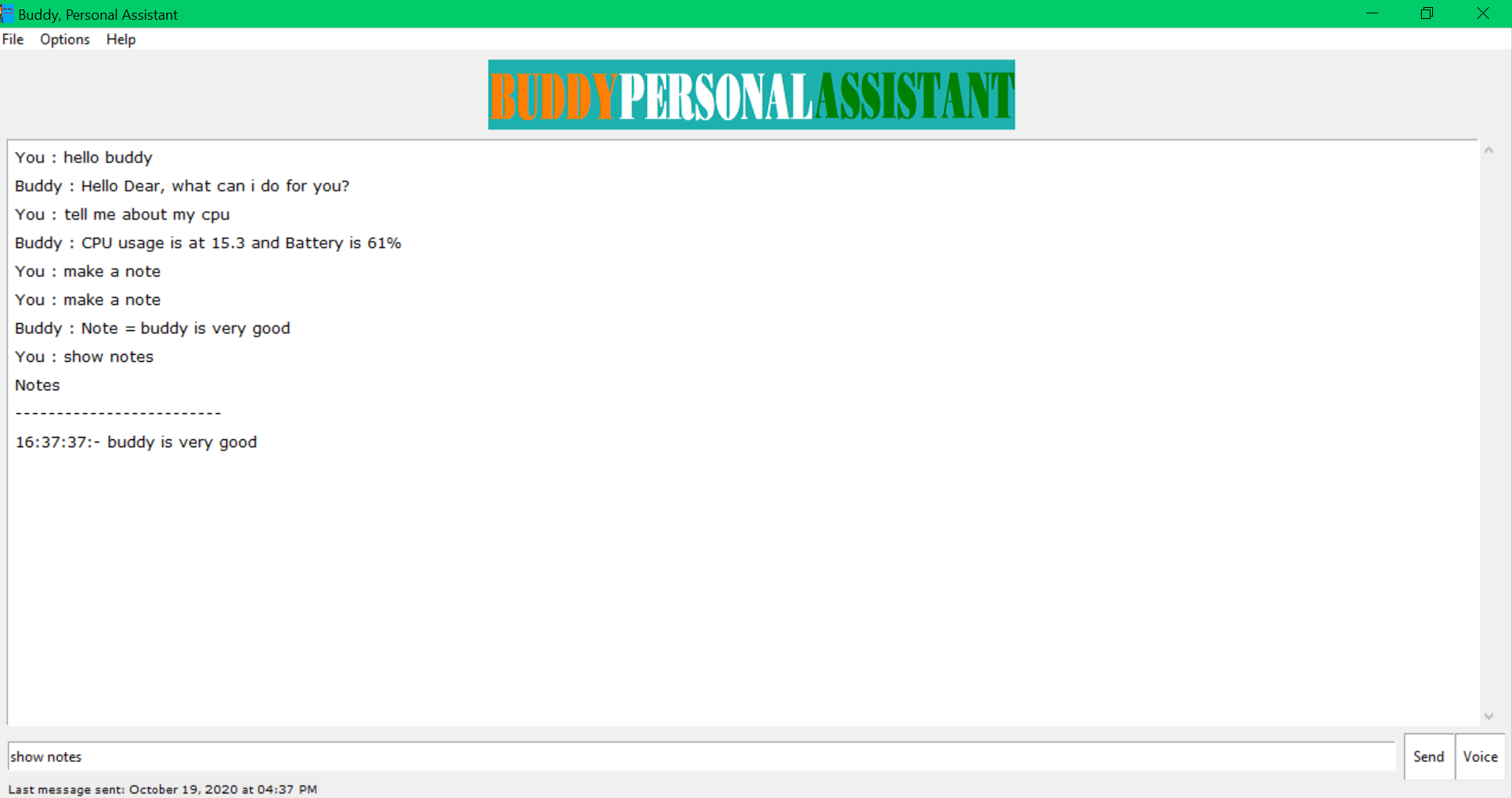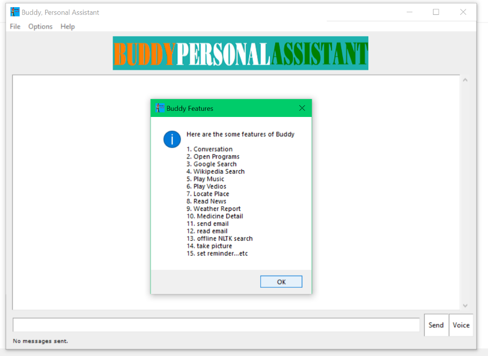 - Buddy works in both online and offline mode. User and Buddy both will interact with the help of GUI application window. It supports both voice and text commands for performing operations.